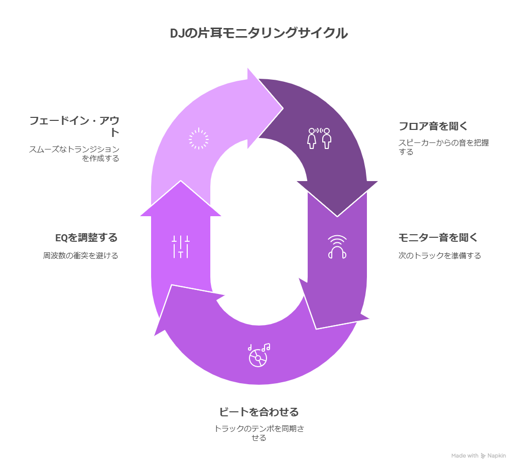 💡特にハウス・テクノ・EDMなど、曲のテンポがつながるジャンルでは、この片耳使いがパフォーマンスの要となります。